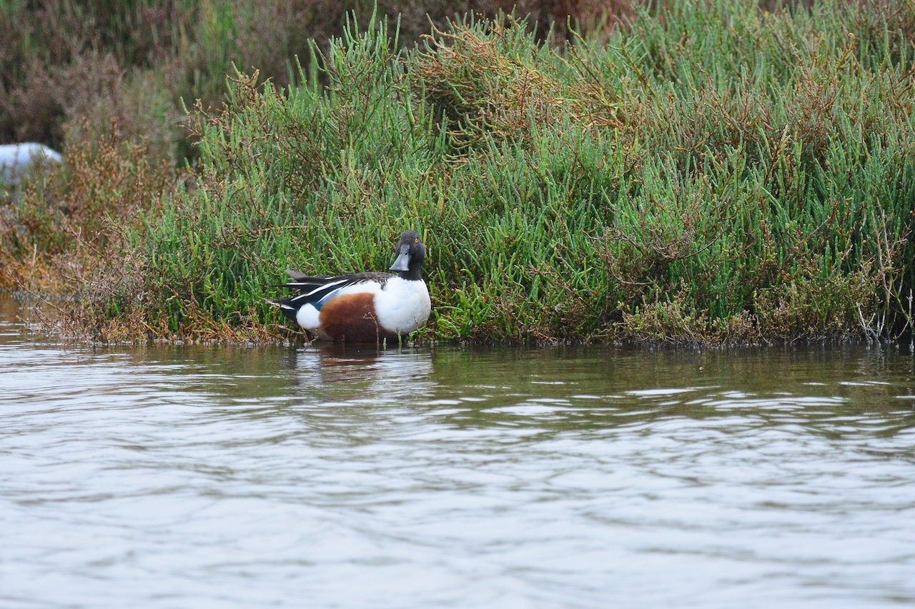 | Spatula clypeata - Canard souchet - Maroc Oualidia immanquable avec son grand bec spatulé ; tête verte pour le mâle reproducteur, avec une poitrine blanche et des flancs couleur châtaigne ; barbote à la recherche de nourriture végétale en balançant souvent son bec d'un côté à l'autre, s'en servant pour filtrer les aliments de l'eau ; des lamelles disposées sur le bec, comme un peigne, agissent en effet comme un tamis, lui conférant un avantage non négligeable sur d'autres canards de surface. |