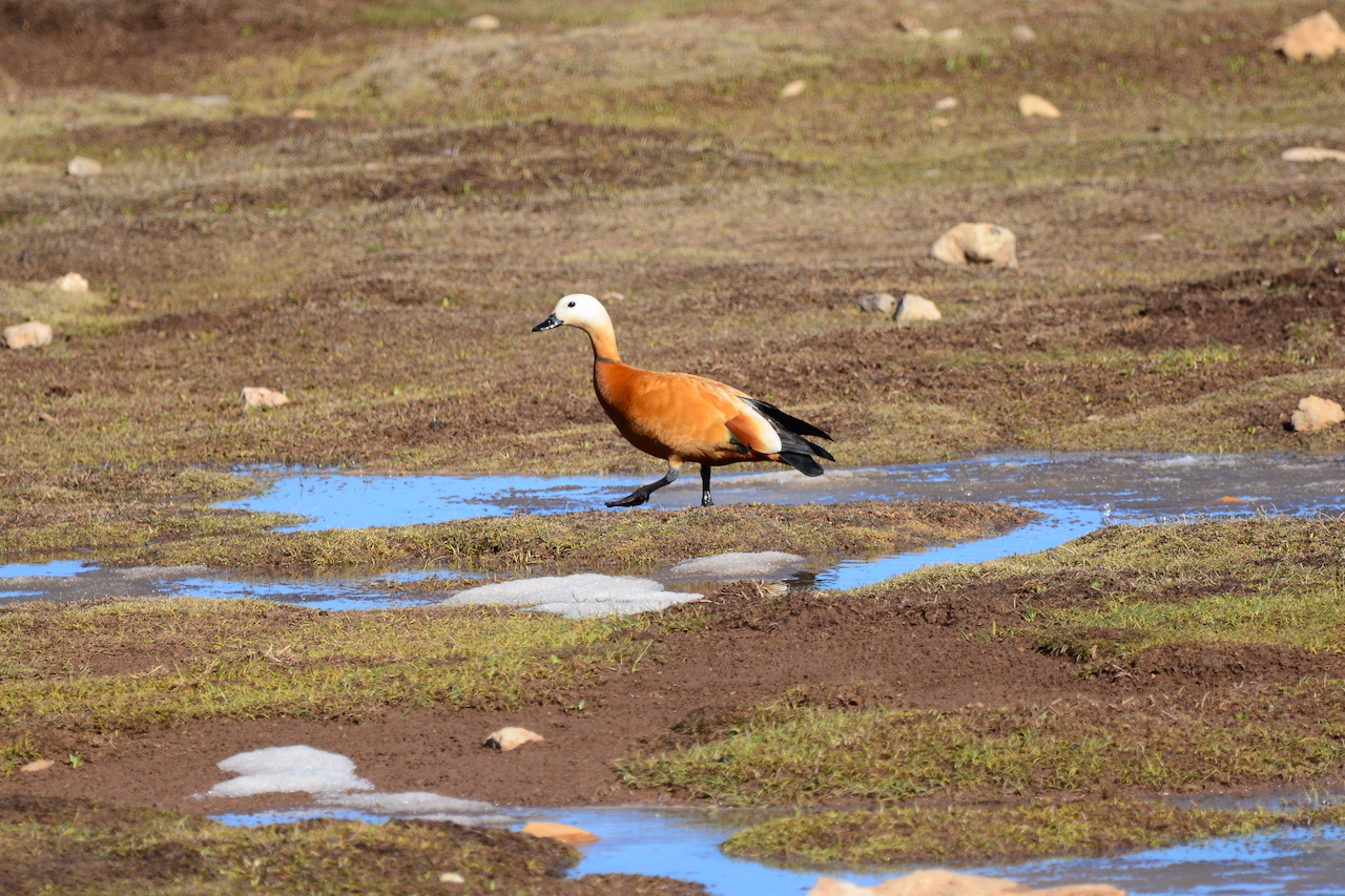 | Tadorna ferruginea - Tadorne casarca - Maroc Ifrane gros canard aisément identifiable à son plumage brun orangé et un tête et un cou plus pâles, séparés du corps par un étroit collier noir ; croupe noire ; oiseau essentiellement eurasiatique avec néanmoins de petites populations dans le nord-ouest de l'Afrique ; il s'active surtout la nuit, étant omnivore et barbotant dans les bas-fonds. |