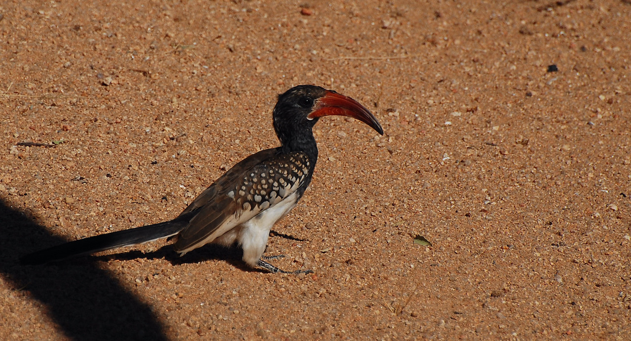 | Tockus rufirostris - Calao d'Afrique du Sud - Botswana Parc National de Chobe les deux sexes sont de couleur similaire, avec un long bec rouge, à la mandibule inférieure tirant sur le noir ; l'iris est jaune, la peau orbitale pâle ; plumage noirâtre strié ; gorge blanche ; passe du temps au sol à la recherche d'insectes. |